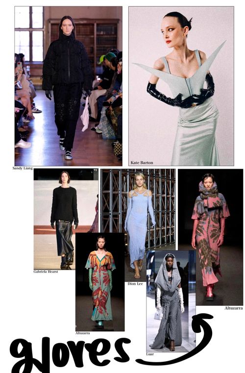 Although, is it just me, or are gloves too "costume-y" when they come in a latex fabric? I love the Kate Barton look above, but the gloves are giving more "cat woman" than anything else. I like the approach that Sandy Liang and Dion Lee took more with their short or mesh see-through gloves. To make this accessory work in modern day, it has to fit within the outfit and not appear as an "add on".