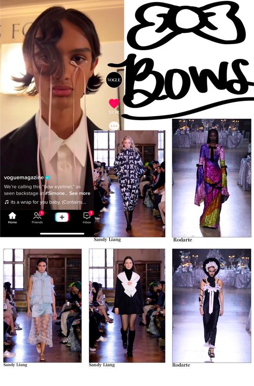 Now, bows are being worn in a "ballet-core" fashion as they are thinner and hold less shape. The bows from the runway look more like ribbon which I love! I am definitely going to try and bring these into my style, maybe for a Coachella outfit? Not sure yet, but I cannot get over how cool it is to bring into your makeup. Simone Rocha ate with this ribbon appliqué on her models.